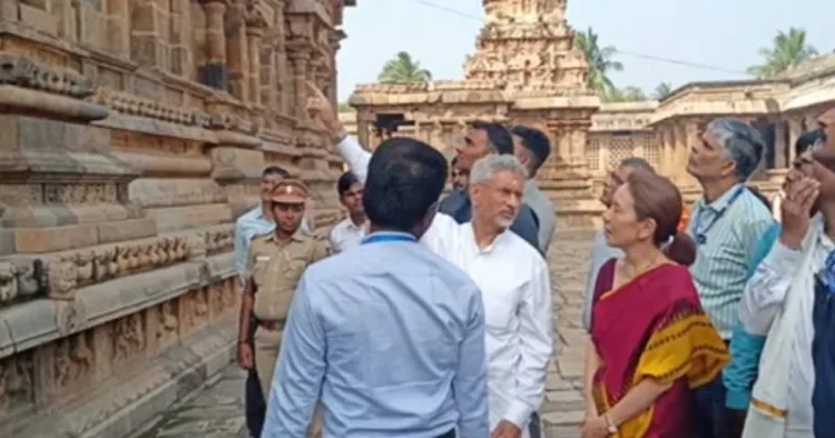தஞ்சை மாவட்டம் தாராசுரம் ஐராவதேஸ்வரர் கோயிலில் மத்திய அமைச்சர் ஜெய்சங்கர் தனது மனைவியுடன் சாமி தரிசனம் செய்தார்.