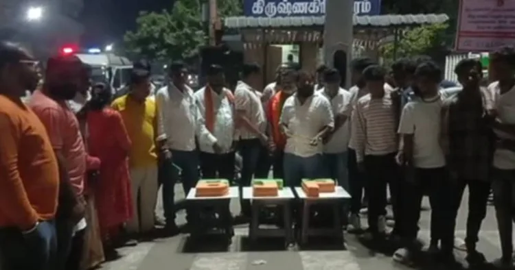 கிருஷ்ணகிரி ரவுண்டானா பகுதியில் பாஜகவினர் கேக் வெட்டி ஆங்கில புத்தாண்டை உற்சாகமாக கொண்டாடினர்.