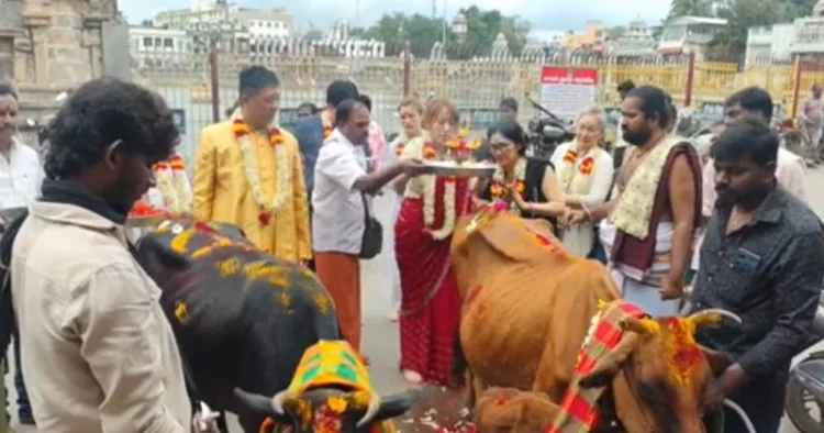 ஆங்கில புத்தாண்டை முன்னிட்டு உலக நன்மை வேண்டி கும்பகோணம் அபி முகேஸ்வரர் கோயிலில் தைவான் நாட்டை சேர்ந்த பக்தர்கள் ஏகத்துவ மகா ருத்ர ஹோமம் செய்து வழிபட்டனர்.