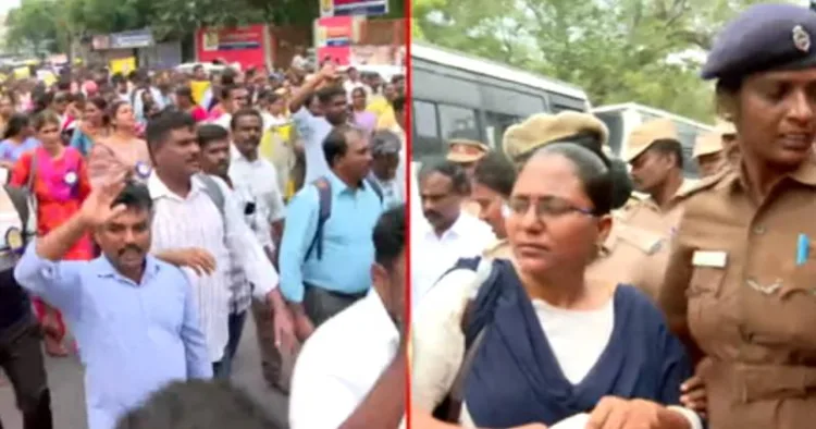 சம வேலைக்கு சம ஊதியம் என்ற ஒற்றைக் கோரிக்கையை வலுயுறுத்தி சென்னையில் கடந்த 15நாட்களாக இடை நிலை ஆசிரியர்கள் தொடர் போராட்டத்தில் ஈடுபட்டு வருகின்றனர். அந்த வகையில், சென்னை திருவல்லிக்கேணியில் உள்ள வாலாஜா சாலையில் ஆயிரக்கணக்கான இடைநிலை ஆசிரியர்கள் தலைமைச் செயலகத்தை நோக்கி பேரணியாக செல்ல முயன்றனர். அப்போது அவர்களை தடுத்து நிறுத்திய போலீசார், ஆயிரத்து 500 இடைநிலை ஆசிரியர்கள் மீது 3 பிரிவுகளின் கீழ் வழக்கு பதிவு செய்துள்ளனர்.