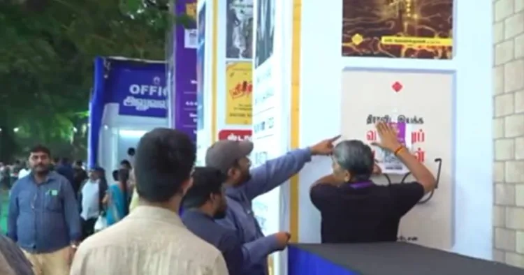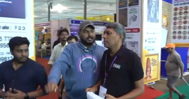 சென்னை புத்தக காட்சியில் திராவிட இயக்க வரலாற்று புரட்டுகள் புத்தகத்தின் விளம்பரத்தை மறைக்க முயன்ற நபரை தமிழ் ஜனம் செய்தி குழுவினர் சூழ்ந்து கொண்டு கேள்வி எழுப்பினர்.