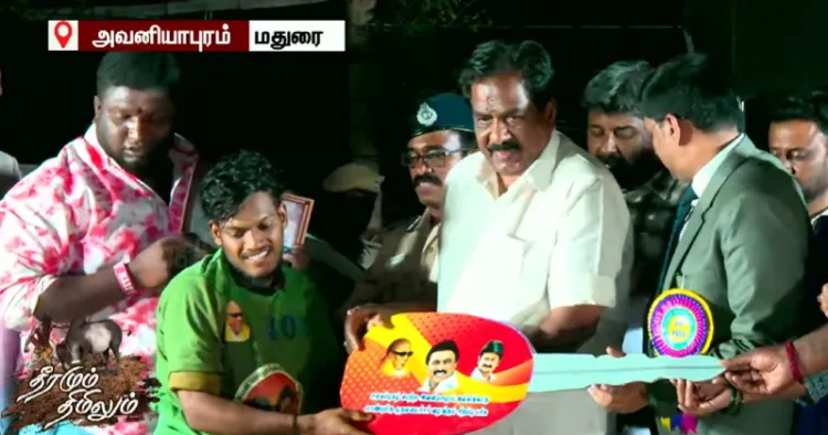 17 காளைகளை அடக்கிய அவனியாபுரம் கார்த்திக்கு இரண்டாம் பரிசாக இருசக்கர வாகனம் பரிசாக வழங்கப்பட்டது