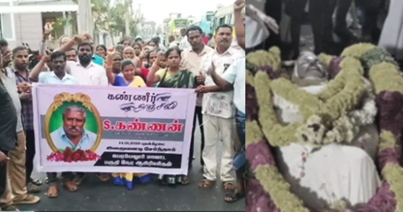 சென்னையில் நடைபெற்ற இடைநிலை ஆசிரியர் போராட்டத்தின்போது, விஷம் அருந்தி தற்கொலை செய்துகொண்ட ஆசிரியர் கண்ணனின் உடல் அவரது சொந்த ஊருக்கு கொண்டு செல்லப்பட்டது.