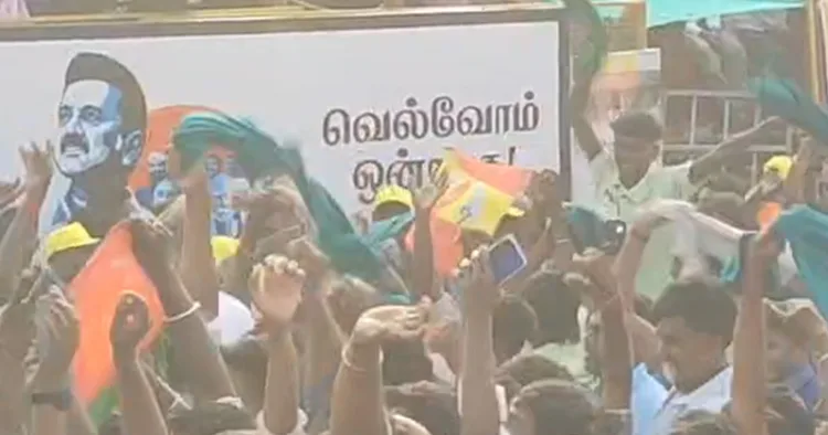 மதுரை மாவட்டம் பாலமேட்டில் நடந்த ஜல்லிக்கட்டு போட்டியில் முதலில் அவிழ்த்து விடப்படுவதற்காக கோயில் காளைகள் அழைத்து வரப்பட்டன. அப்போது, போட்டி திடலில் கூடியிருந்த இளைஞர்களில் சிலர், தமிழக வெற்றிக் கழகத்தின் கொடியை கையில் தூக்கி பிடித்து காண்பித்தனர். இதனைக் கண்ட விழா குழுவினர், கட்சி கொடியை காண்பிக்க கூடாது எனக்கூறி இளைஞர்களை அனுப்பி வைத்தனர். இந்த வீடியோ சமூக வலைதளங்களில் வெளியாகி வைரலாகி வருகிறது.