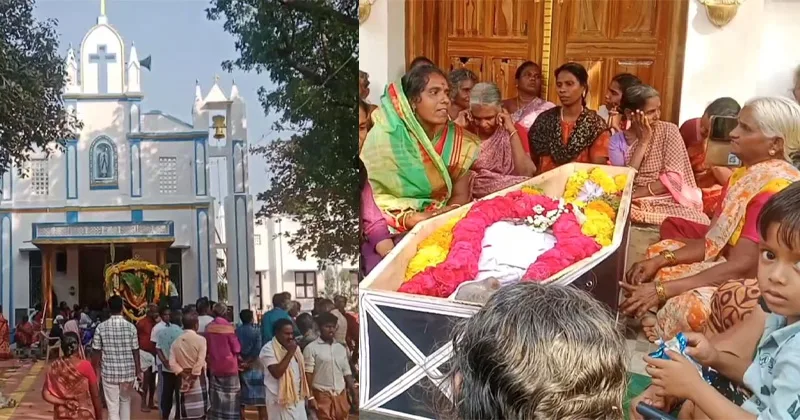 புதுக்குப்பம் கிராமத்தை சேர்ந்த ஏசுதாஸ் என்பவர் உயிரிழந்த நிலையில் அவரது உடல், திருப்பலி செய்வற்காக தேவாலயத்திற்கு எடுத்து செல்லப்பட்டது.
