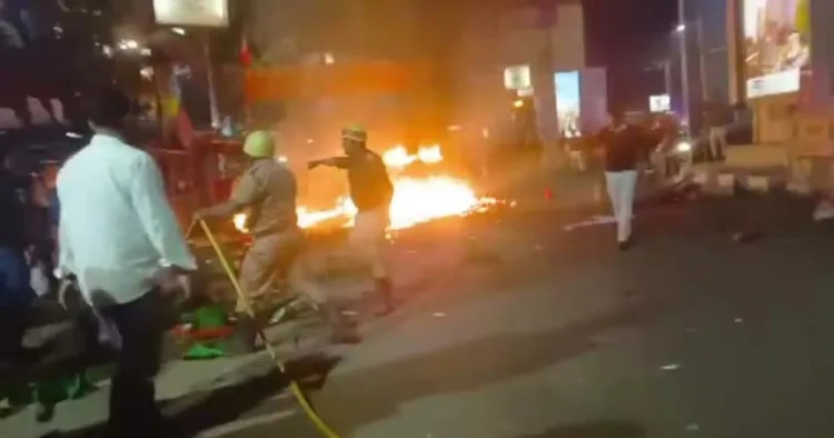அதனை பாஜகவினர் தடுத்த நிலையில் இருதரப்பிற்கும் இடையே மோதல் வெடித்து ஒருவரை ஒருவர் தாக்கிக் கொண்டனர். தொடர்ந்து பொதுக்கூட்ட மேடைக்கு TMC தொண்டர்கள் தீ வைத்து எரித்தனர்.