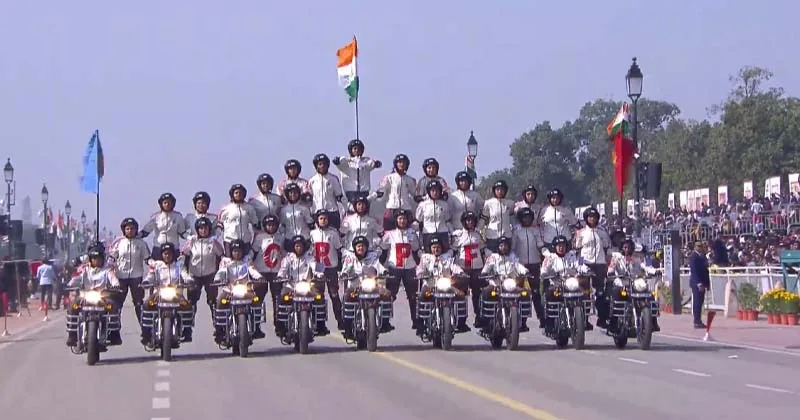 இதனை தொடர்ந்து, சிஆர்பிஎப் மற்றும் எஸ்எஸ்பி படை பிரிவினர் இருசக்கர வாகனங்களில் அணிவகுத்து சென்று பல்வேறு சாகசங்களை நிகழ்த்தி காட்டினர். இருசக்கர வாகனங்களில் வீரர்கள் யோகாசனம் செய்து அசத்தினர்.