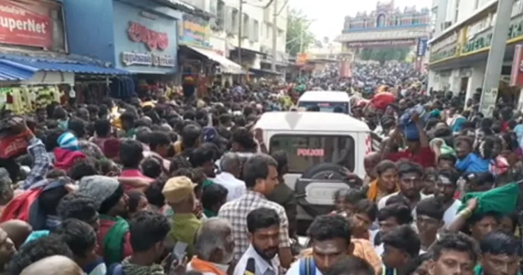 ஏடிஎஸ்பி வாகனம் உள்ளே நுழைந்த அதே நேரத்தில், எதிர்திசையில் மற்றொரு காவல்துறை வாகனம் வந்தது. 2 வாகனங்களும் நகர முடியாமல் நின்றதால், அந்தப் பகுதியில் பக்தர்கள் செல்ல வழியின்றி கடும் கூட்ட நெரிசல் ஏற்பட்டது.