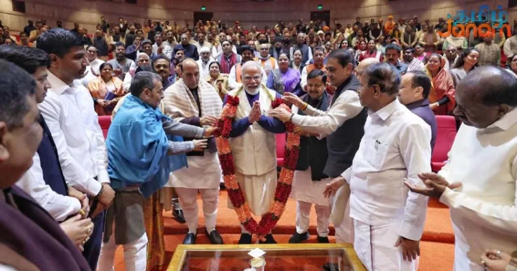 தேசிய ஜனநாயக கூட்டணியின் எம்பிக்கள் கூட்டத்தில் புதிய பாஜக தலைவர் நிதின் நபினுக்கு பிரதமர் மோடி மாலை அணிவித்து வாழ்த்து தெரிவித்தார்.