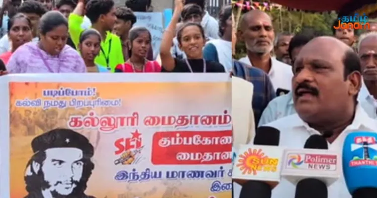 கும்பகோணம் அரசு ஆடவர் கல்லூரியில் உள் விளையாட்டு அரங்கம் கட்ட எதிர்ப்பு தெரிவித்து மாணவர்கள் போராட்டத்தில் ஈடுபட்டுள்ளனர்.