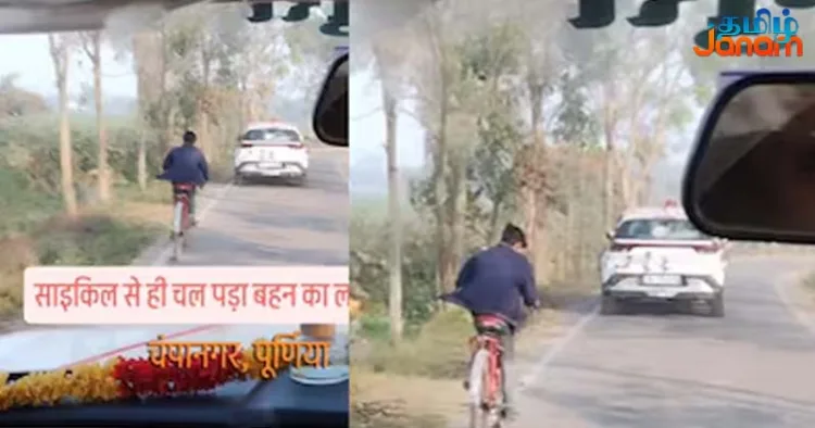 திருமணத்திற்குப் பிறகு தனது புகுந்த வீட்டிற்குச் செல்லும் சகோதரியின் விடைபெறும் நிகழ்வின்போது, அவருடன் செல்ல காரில் இடம் கிடைக்காததால், அவரது தம்பி சுமார் 70 கிலோ மீட்டர் தூரம் மிதிவண்டியிலேயே பின்தொடர்ந்து சென்றுள்ளார்.