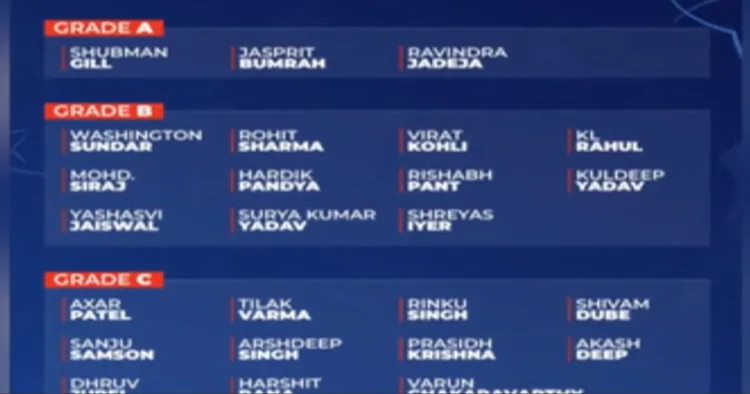 பிசிசிஐ வெளியிட்ட பட்டியலில் ஏ பிரிவில் சுப்மன் கில், பும்ரா, ஜடேஜா ஆகியோர் மட்டுமே இடம்பெற்றுள்ளனர்.ஒருநாள் போட்டியில் மட்டும் விளையாடுவதால் விராட் கோலியும், ரோகித் ஷர்மாவும் பி கிரேடுக்கு மாற்றப்பட்டுள்ளனர்.