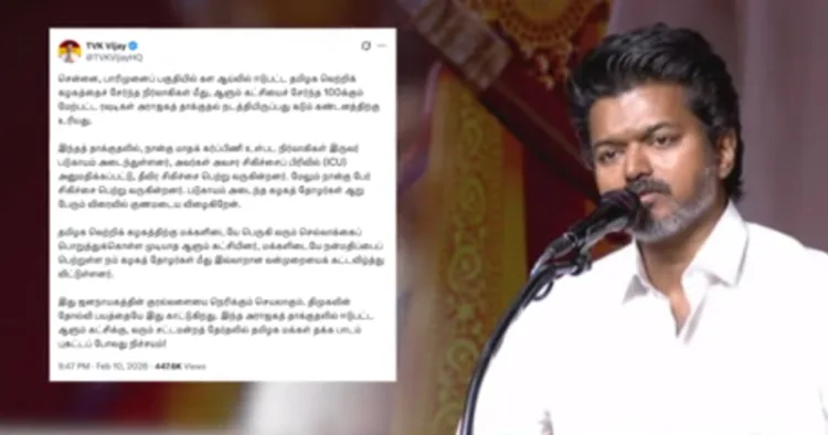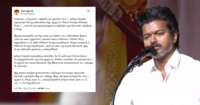 இது ஜனநாயகத்தின் குரல்வளையை நெரிக்கும் செயல் என விமர்சித்துள்ள விஜய், இந்த தாக்குதல் திமுகவின் தோல்வி பயத்தை காட்டுவதாக குறிப்பிட்டுள்ளார்.