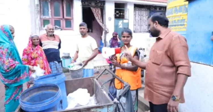 தொடர்ந்து, அவர்களுக்கு ஒலிபெருக்கி ஒன்றையும் வழங்கி, அதன் மூலம் அறிவிப்பு செய்து குப்பைகளைச் சேகரிக்குமாறு அறிவுறுத்தியுள்ளார். இந்நிலையில், இச்சம்பவத்தை தவெக தொண்டர்கள் மற்றும் விஜய் ரசிகர்கள் சமூக வலைதளங்களில் கிண்டல் செய்து வருகின்றனர்.