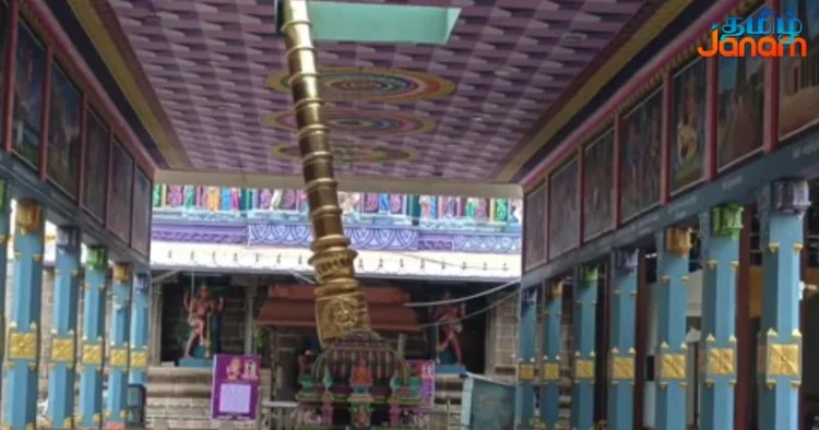 இந்நிலையில் கொடிமரம் திடீரென சரிந்து மண்டபத்தில் சாய்ந்தபடி நின்றது. கொடி மரத்தின் அடிப்பகுதியில் ஏற்பட்ட பாதிப்பு காரணமாகவே கொடிமரம் சாய்ந்துள்ளது என்பது தெரியவந்தது.