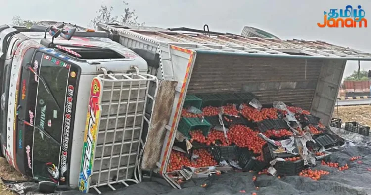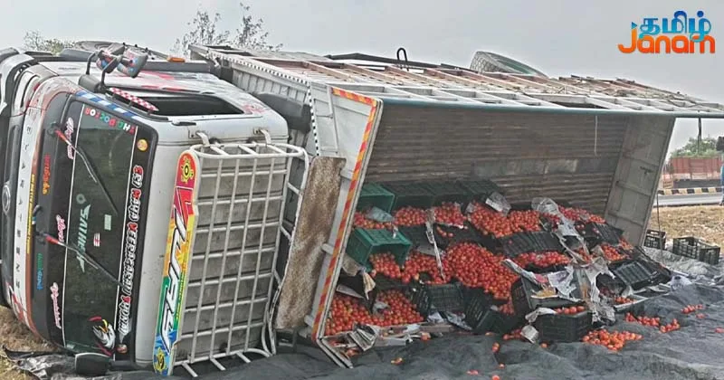 சரக்கு வாகனம் தலைகுப்புற கவிழ்ந்து விபத்து – 3 டன் தக்காளி சேதம்!