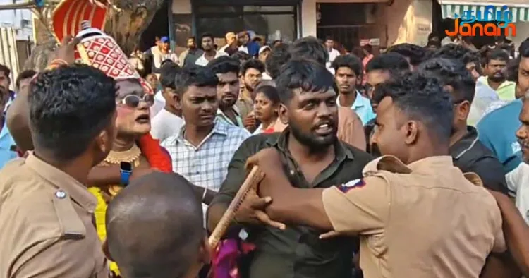 இதனையடுத்து பாதுகாப்பு பணியில் இருந்த போலீசார், சுவாமி ஊர்வலம் தொடர்ந்து செல்ல நடனமாடுவதை நிறுத்துமாறு அவர்களிடம் கூறினர்.