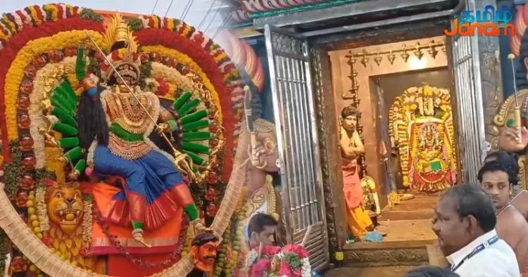 அப்போது அலங்கரிக்கப்பட்ட தேரில் அம்மன், ஊர்வலமாக ஈசானிய மயானத்திற்கு சென்றார். அப்போது பக்தர்கள் காளி, சிவன், பார்வதி, முருகன் போன்ற தெய்வங்களின் வேடங்களை அணிந்து தங்களது நேர்த்திக்கடனை செலுத்தினர்.