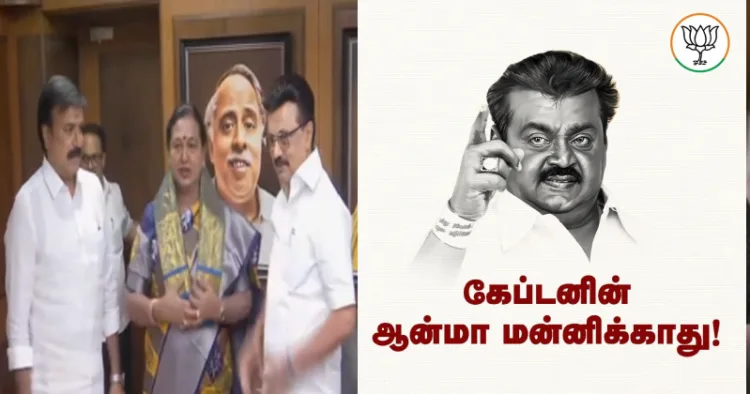 மக்கள் விரோத திமுகவுடன் கேப்டன் உருவாக்கிய இயக்கம் இணைந்ததை அவரது ஆன்மா ஒருபோதும் மன்னிக்காது என்றும் அதில் கூறப்பட்டுள்ளது.
