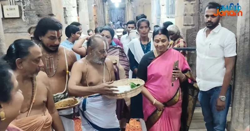 சிவகங்கை மாவட்டம் திருப்பத்தூர் அடுத்த திருக்கோஷ்டியூர் சௌமிய நாராயண பெருமாள் கோயிலுக்கு துர்கா ஸ்டாலின் வருகை தந்தார்.