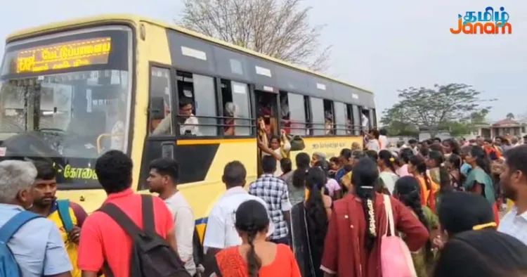 மேலும், அவ்வழியாக சென்ற அரசுப் பேருந்துகளிலும் கூட்டம் நிரம்பி வழிந்தது. பேருந்தில் பெண்கள் முண்டியடித்துக்கொண்டு ஏறியதுடன், படிக்கட்டுகளில் தொங்கியவாறு பயணித்தது அதிர்ச்சியை ஏற்படுத்தியது.