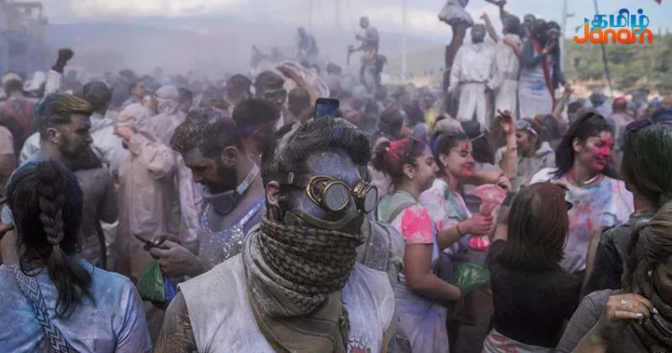 தற்போது டன் கணக்கில் பல்வேறு வண்ணங்களில் மாவுகளை ஒருவர் மீது ஒருவர் பூசி மகிழ்கின்றனர். மாவுப் பொடிகளால் பாதிப்பு ஏற்படாமல் இருக்க, வீடுகள் மற்றும் கடைகளின் முன்பகுதிகள் பிளாஸ்டிக் தாள்களால் முழுமையாக மூடப்பட்டிருந்தன.