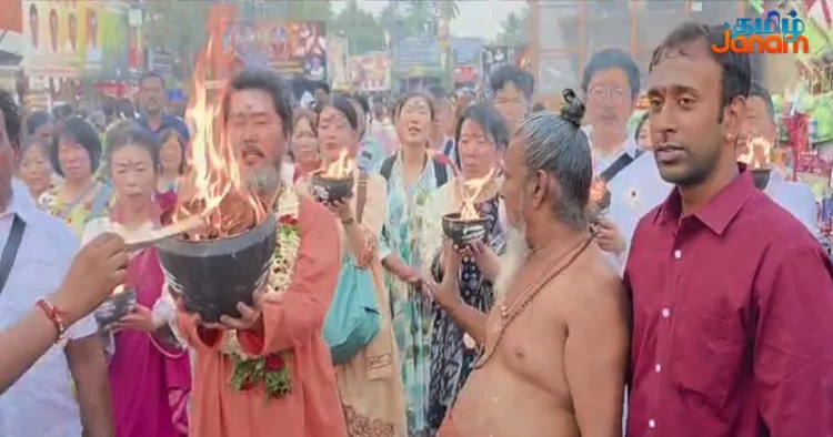 திண்டுக்கல் மாவட்டம் பழனி மாரியம்மன் கோயிலில் ஜப்பான் நாட்டைச் சேர்ந்த பக்தர்கள் தீச்சட்டி எடுத்து வழிபாடு செய்தனர்.