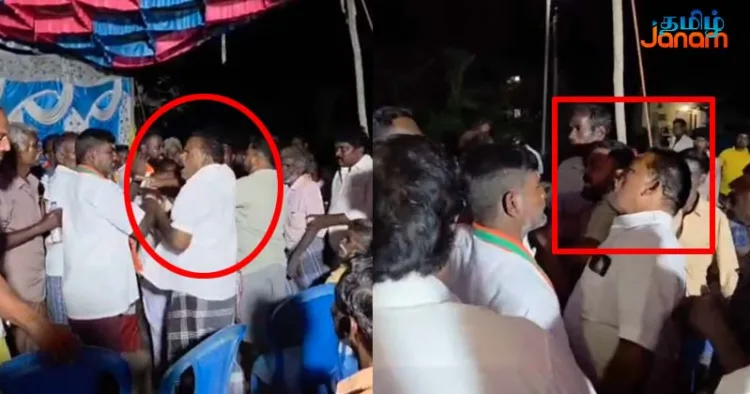 அப்போது திமுகவைச் சேர்ந்த இருவர், ராதாகிருஷ்ணனின் பேச்சை இடைமறித்து அவரை ஆபாசமாகத் திட்டி தாக்க முயன்றனர்.