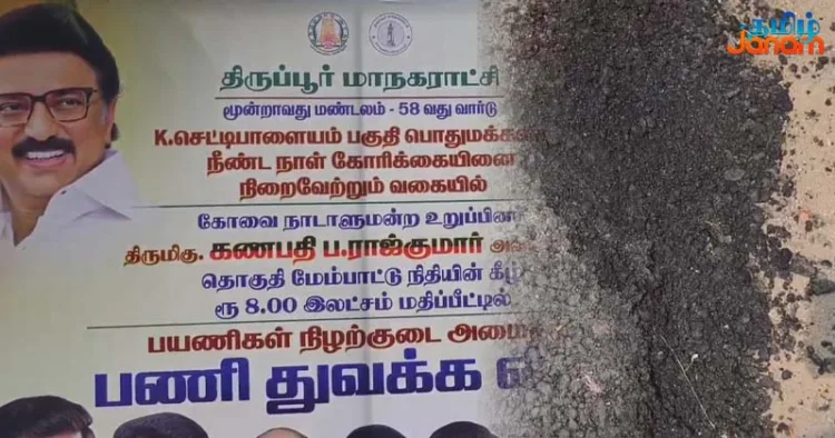 திருப்பூர் மாவட்டம், செட்டிப்பாளையம் பகுதியில் அவசர கதியில் போடப்பட்ட தார்சாலை தனியே பெயர்ந்து வரும் வீடியோ இணையத்தில் வைரலாகி வருகிறது.