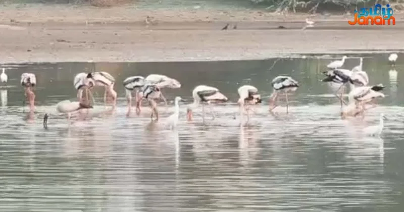 அக்ரகாரம் ஏரியில் நீர் வற்றியுள்ளதால் அதில் உள்ள மீன்கள், நத்தைகள், புழு பூச்சிகளை உண்பதற்காக ஆயிரக்கணக்கான பறவைகள் ஒரே நேரத்தில் குவிந்துள்ளன.