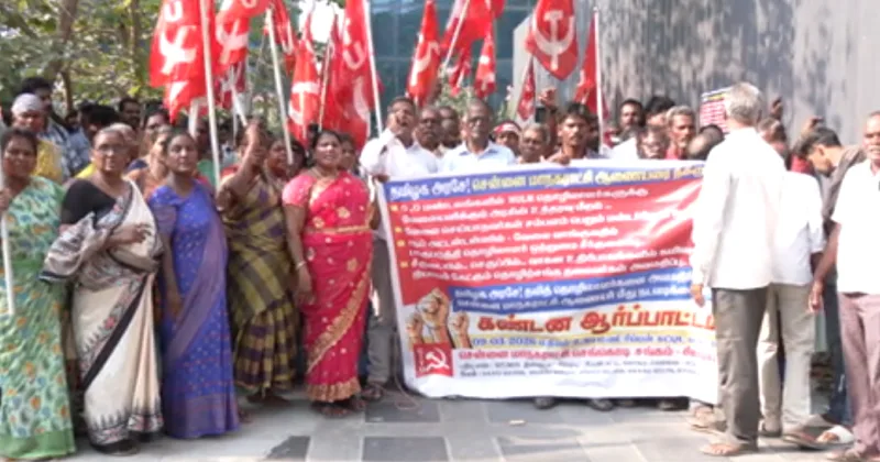 சென்னை மாநகராட்சி ஆணையர் குமரகுருபரனை நீக்கக்கோரி ரிப்பன் மாளிகை வளாகத்தில் மாநகராட்சி செங்கொடி சங்கத்தினர் கண்டன ஆர்ப்பாட்டத்தில் ஈடுபட்டனர்.