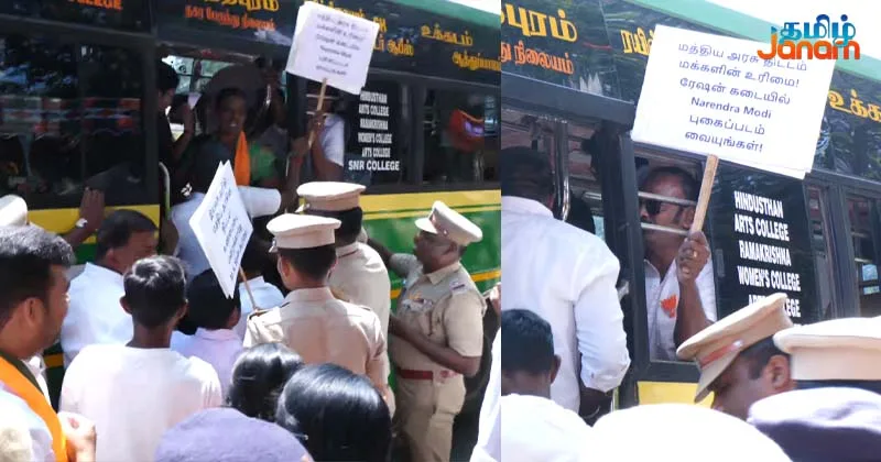 கோவையில் ரேஷன் கடைகளில் பிரதமர் மோடியின் புகைப்படத்தை வைக்க வலியுறுத்தி பாஜகவினர் போராட்டத்தில் ஈடுபட்டனர்.