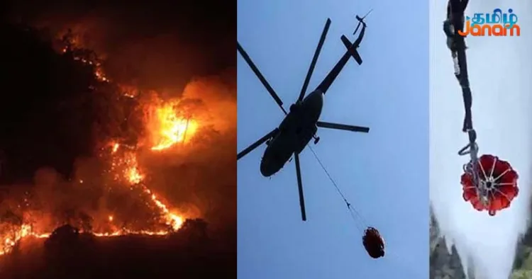 அதன்படி Mi-17 V5 ரக ஹெலிகாப்டர் மூலம், அங்குள்ள ஆற்றில் தண்ணீரை எடுத்து, தீயை அணைக்கும் பணியில் வீரர்கள் ஈடுபட்டுள்ளனர்.