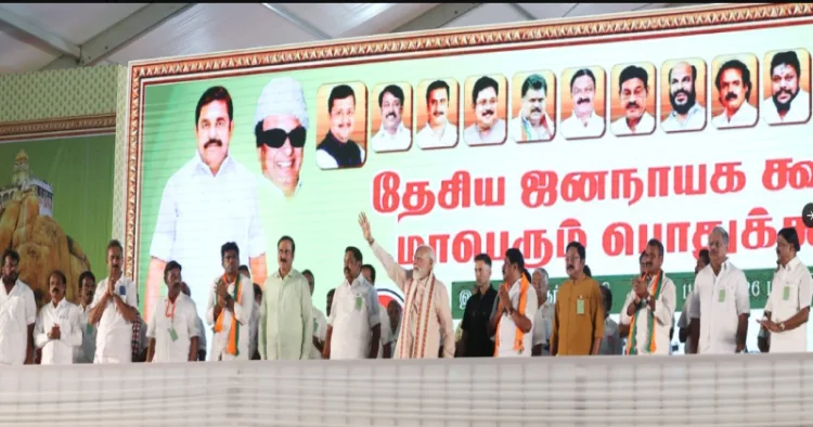 திருச்சி பஞ்சப்பூரில் தேசிய ஜனநாயக கூட்டணி மாநாடு நடைபெற்றது. இதில் அதிமுக பொதுச் செயலாளர் எடப்பாடி பழனிசாமி, பாஜக மாநில தலைவர் நயினார் நாகேந்திரன், பாமக தலைவர் அன்புமணி, அமமுக பொதுச் செயலாளர் டிடிவி தினகரன் உள்ளிட்ட கூட்டணி கட்சி தலைவர்களும் கலந்து கொண்டனர். அப்போது மேடையில் பிரதமர் மோடிக்கு கூட்டணி தலைவர்கள் அனைவரும் இணைந்து நினைவு பரிசினை வழங்கினர்.