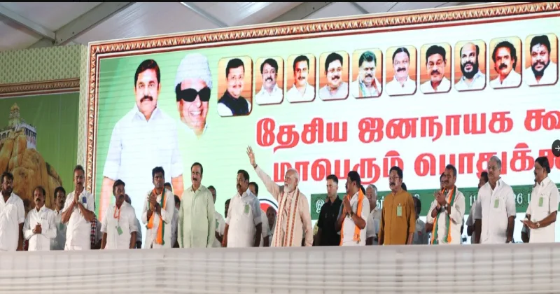 திருச்சி பஞ்சப்பூரில் தேசிய ஜனநாயக கூட்டணி மாநாடு நடைபெற்றது. இதில் அதிமுக பொதுச் செயலாளர் எடப்பாடி பழனிசாமி, பாஜக மாநில தலைவர் நயினார் நாகேந்திரன், பாமக தலைவர் அன்புமணி, அமமுக பொதுச் செயலாளர் டிடிவி தினகரன் உள்ளிட்ட கூட்டணி கட்சி தலைவர்களும் கலந்து கொண்டனர். அப்போது மேடையில் பிரதமர் மோடிக்கு கூட்டணி தலைவர்கள் அனைவரும் இணைந்து நினைவு பரிசினை வழங்கினர்.