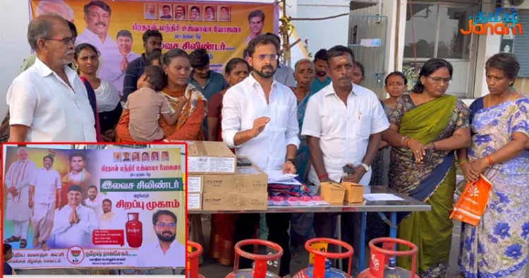 நாமக்கல்லில் பிரதமரின் உஜ்வாலா திட்டத்தின் கீழ் பொதுமக்களுக்கு இலவச சிலிண்டர் வழங்கப்பட்டு பாஜக சார்பில் விழிப்புணர்வு ஏற்படுத்தப்பட்டது.