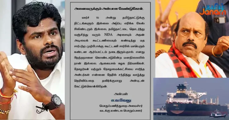 ஒருபுறம், முதலமைச்சர் ஸ்டாலின் சமையல் எரிவாயு தட்டுப்பாடு இல்லை என்று கூறிக் கொண்டிருக்கையில், அவரது அமைச்சரவையில் இருந்து கொண்டு, தனது பிறந்த நாள் விளம்பரத்துக்காக, பொதுமக்களிடையே வீண் பீதியை ஏற்படுத்துவதை அண்ணன் திரு. வேலு அவர்கள் நிறுத்திக் கொள்ள வேண்டும் எனவும் எதுவுமே தெரியாவிட்டாலும், எல்லாம் தெரிந்ததைப் போல, கிரிக்கெட்டில் எத்தனை கோல் அடித்தார்கள் என்ற திமுகவினரின் வழக்கத்தை, இது போன்ற தருணங்களில் காட்டுவது, அவர் வகிக்கும் பொறுப்புக்கு அழகல்ல என தேசிய பொதுக்குழு உறுப்பினர் அண்ணாமலை தெரிவித்துள்ளார்
