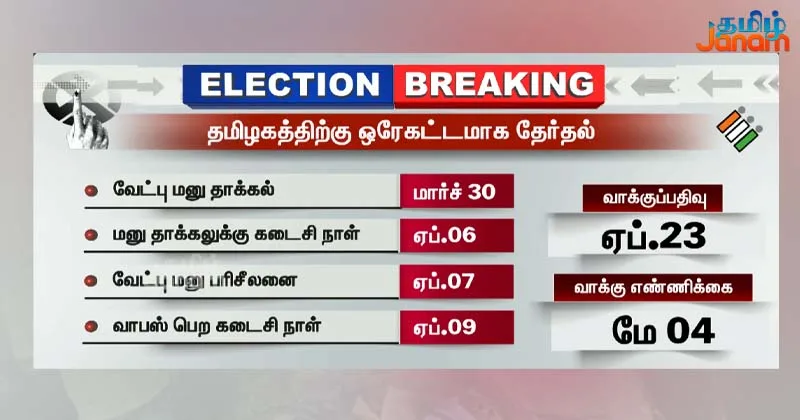 தமிழகத்தில் ஏப்ரல் 23-ந் தேதி வாக்குப்பதிவு ஒரே கட்டமாக நடைபெறும் என்றும் வாக்கு எண்ணிக்கை மே 4ம் தேதி என்றும் ஞானேஷ்குமார் அறிவித்தார்.