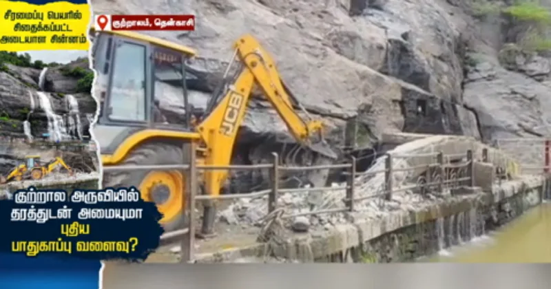 புகழ்பெற்ற சுற்றுலா தலமான குற்றாலத்தின் அடையாளச் சின்னமாக விளங்கிய மெயின் அருவியின் பாதுகாப்பு வளைவு, சீரமைப்பு பணி என்ற பெயரில் முற்றிலுமாக இடித்து அகற்றப்பட்டுள்ளதாக பொதுமக்கள் வேதனை தெரிவிக்கின்றனர். அதுதொடர்பான முழு விபரங்களை இந்த செய்தி தொகுப்பில் பார்க்கலாம்…
