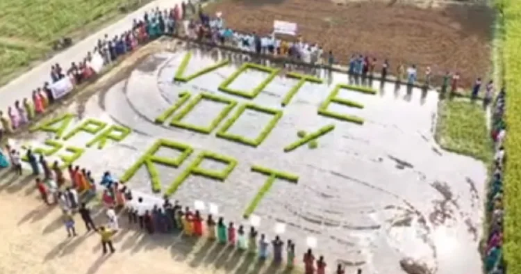 இந்த நிகழ்ச்சியில், வயல்வெளிகளில் பயிர்களை பயன்படுத்தி “VOTE 100% APR 23 RPT” என்ற ஆங்கில வாசகத்தை அழகாக வடிவமைத்திருந்தனர்.