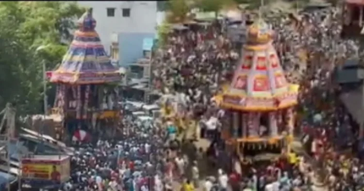வழிநெடுகிலும் நின்றிருந்த ஆயிரக்கணக்கான பக்தர்கள் பக்தி கோஷங்கள் முழங்க தேரை வடம் பிடித்து இழுத்து வழிபட்டனர்.
