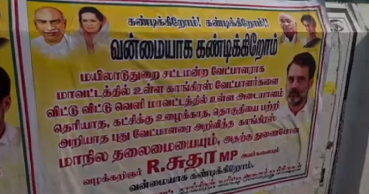 மயிலாடுதுறையில் எம்பி சுதா மற்றும் காங்கிரஸ் தலைமைக்கு எதிராக ஒட்டப்பட்டுள்ள போஸ்டர்களால் கட்சிக்குள் சலசலப்பு ஏற்பட்டுள்ளது.