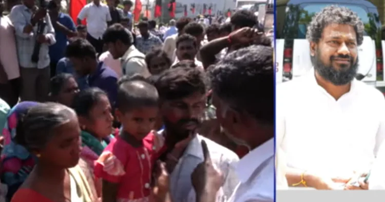 திருச்சி மாவட்டம் மண்ணச்சநல்லூர் தொகுதி திமுக வேட்பாளர் கதிரவனின் ஆதரவாளர்கள் வீடு வீடாக சென்று வாக்காளர்களுக்கு பரிசு பொருட்கள் வழங்கியுள்ளனர். அந்த பகுதியில் உள்ள சிந்துஜா என்ற பெண்ணின் வீட்டிற்கு பரிசுப்பொருள் கொடுக்கவில்லை என கூறப்படுகிறது.