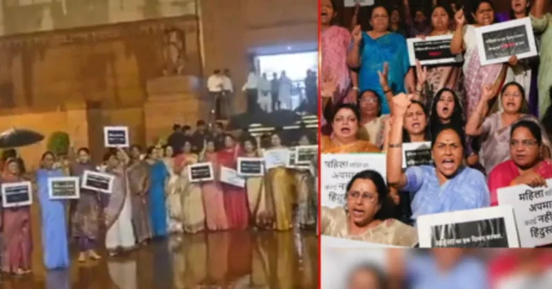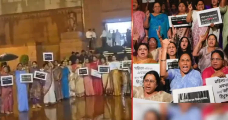இதனையடுத்து எதிர்க்கட்சிகளின் பெண் விரோதப் போக்கை கண்டித்து என்டிஏ பெண் எம்பிக்கள் நாடாளுமன்ற வளாகத்தில் தர்ணாவில் ஈடுபட்டனர்.