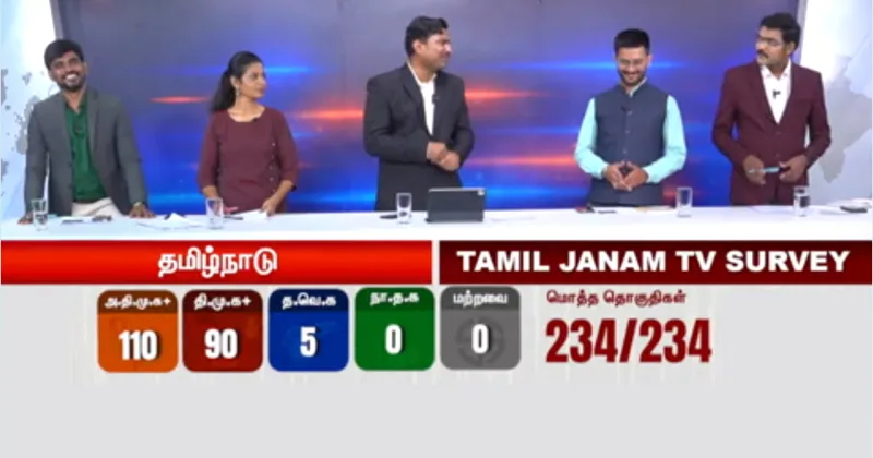 2026ஆம் ஆண்டு தமிழக சட்டமன்றத் தேர்தலை முன்னிட்டு, மக்களின் மனநிலையை அறியும் வகையில் தமிழ் ஜனம் தொலைக்காட்சி மாபெரும் கருத்துக்கணிப்பு நடத்தியது. இதில், என்டிஏ 110 இடங்களைக் கைப்பற்றும் என தெரிவிக்கப்பட்டுள்ளது.