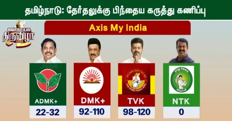 தேர்தலுக்கு பிந்தைய கருத்து கணிப்புகள் வெளியாகியுள்ளன. அதில், இண்டியா டுடேவின் ஆக்சிஸ் மை இண்டியா நிறுவனம் நடத்திய கருத்து கணிப்பில் தவெக 98 முதல் 120 தொகுதிகளை கைப்பற்றி ஆட்சி அமைக்கும் என தெரிவிக்கப்பட்டுள்ளது.