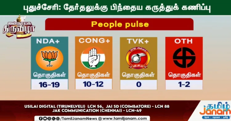 புதுச்சேரியில் யார் ஆட்சி? என்பது தொடர்பாக தேர்தலுக்கு பிந்தைய கருத்துக்கணிப்பு வெளியாகியுள்ளது. அதன்படி, Peoples pulse நடத்திய கருத்துக்கணிப்பில் என்.டி.ஏ. கூட்டணி 16 முதல் 19 இடங்கள் வரை கைப்பற்றி ஆட்சியமைக்கும் என தெரிவிக்கப்பட்டுள்ளது.