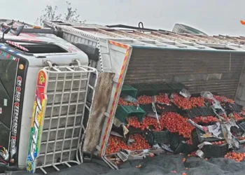 சரக்கு வாகனம் தலைகுப்புற கவிழ்ந்து விபத்து – 3 டன் தக்காளி சேதம்!