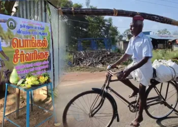 மகளுக்கு சைக்கிளில் வைத்து பொங்கல் சீர் கொண்டு சென்ற முதியவர் – பதாகை வைத்து ஊர்மக்கள் வாழ்த்து!