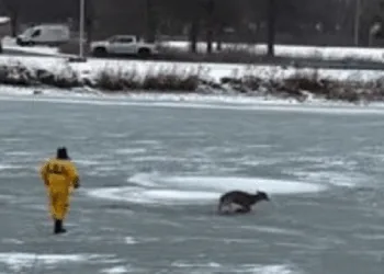அமெரிக்கா : பனியில் சிக்கி பரிதவித்த மான் பத்திரமாக மீட்பு!